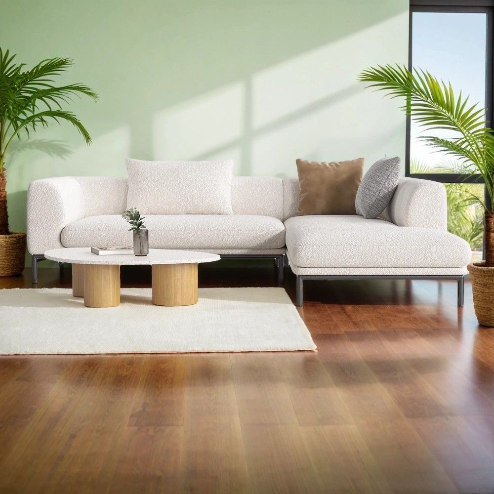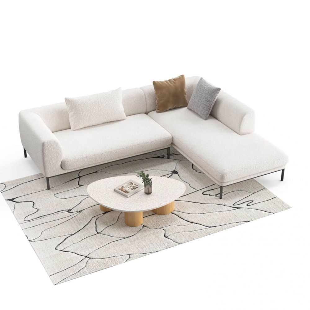 Добавляет лёгкость. Высокие ножки и низкая спинка «поднимают» диван. Комната не выглядит заставленной, даже если диван большой. Создаёт современный образ. Кирпичное букле + металл + чёткая геометрия = интерьер, который выглядит дорого и актуально. Организует пространство. Угловая форма (2700х2140) позволяет разместить 5–6 человек. При этом диван не «съедает» центр комнаты — он работает в углу или вдоль стен. Дарит тактильный комфорт. Букле приятно трогать. ППУ — комфортно сидеть. А высокие опоры позволяют роботу-пылесосу свободно проезжать под диваном.