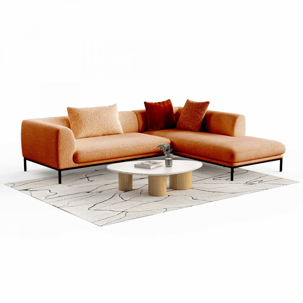 Берёзовая фанера (каркас): Многослойная, плотная, экологичная. Держит сложную геометрию углового дивана без скрипа и деформации. ППУ (наполнитель): Упругий, эластичный, анатомичный. Не проседает, быстро восстанавливает форму. Металлические опоры: Высокие, тонкие, но невероятно прочные. Не царапают пол, не шатаются, не ломаются. Легко моются. И главное — создают тот самый эффект парения. Ткань букле (обивка): Модная, фактурная, «пушистая» на ощупь. Кирпичный оттенок — тёплый, глубокий, благородный. Он не кричит, но заметен. Идеально сочетается с серым, бежевым, чёрным, белым и натуральным деревом.