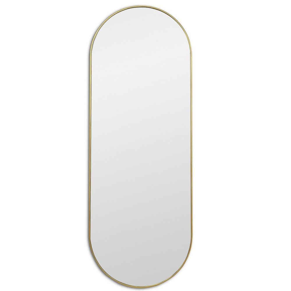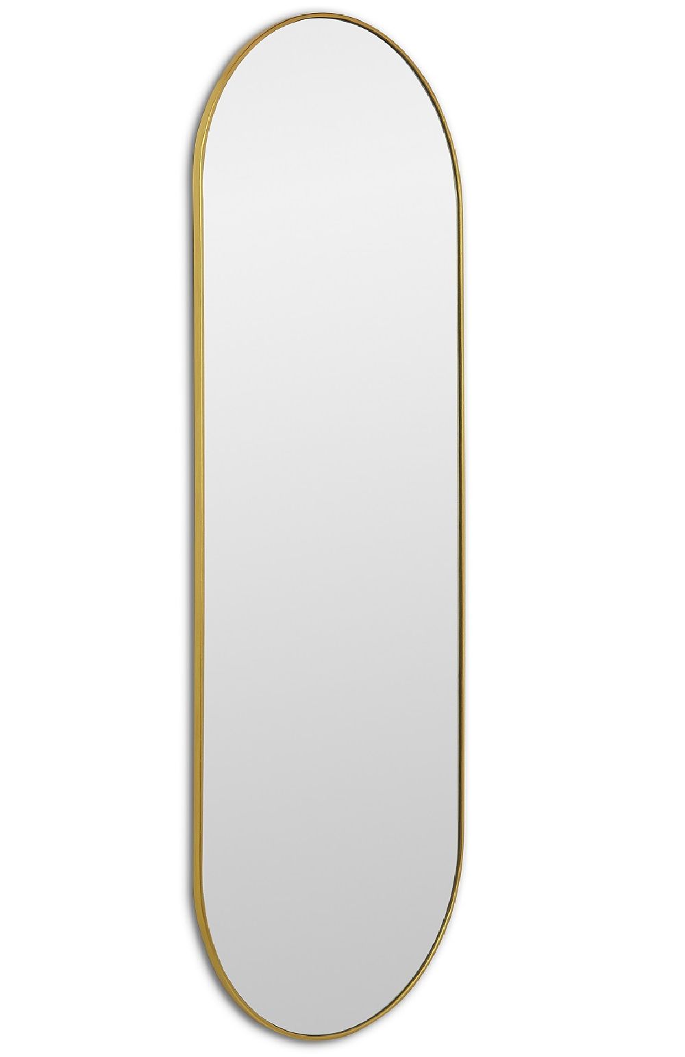 Золотая рама здесь работает как теплый, благородный акцент. Тонкий деревянный профиль обрамляет вытянутое овальное полотно, подчеркивая его изящество. Несмотря на внушительные размеры, зеркало сохраняет воздушность, не превращаясь в тяжеловесную конструкцию. Это не просто функциональный предмет, а полноценный архитектурный элемент, который задает тон всему пространству.