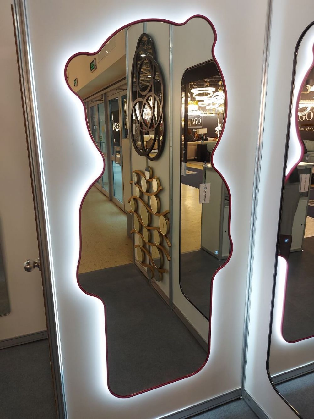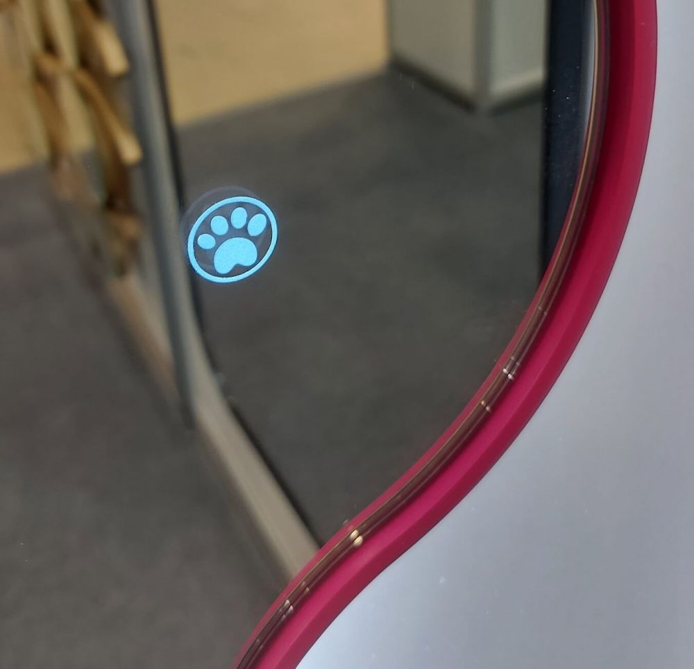 Размер 75×165 см позволяет увидеть себя в полный рост. Цвет фуксия — сочный, жизнерадостный — мгновенно притягивает взгляд. Полировка фацета по краю зеркала добавляет благородного блеска. Влагостойкое покрытие позволяет разместить зеркало даже в ванной.