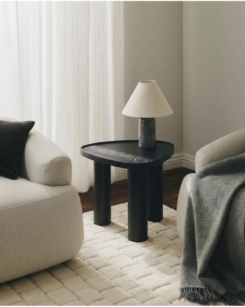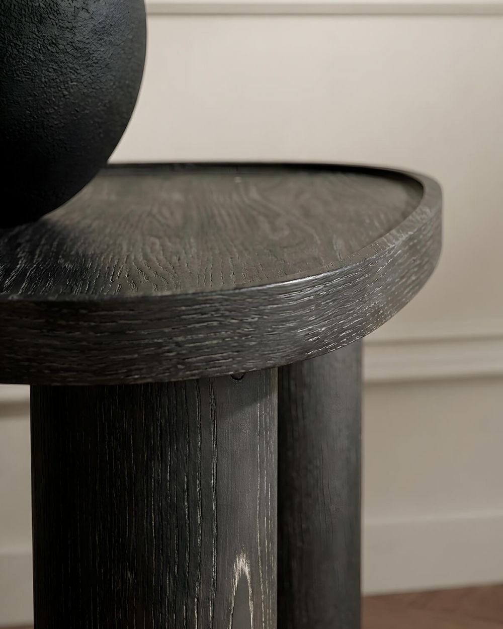 Компактные размеры (53×43×45 см) позволяют использовать его в самых разных местах – рядом с диваном, креслом, кроватью или в углу как самостоятельный акцент. Глубокий черный цвет и текстура дерева, проступающая на поверхности МДФ, придают столику глубину и выразительность, позволяя ему легко сочетаться с мягкой мебелью, текстилем и камнем.