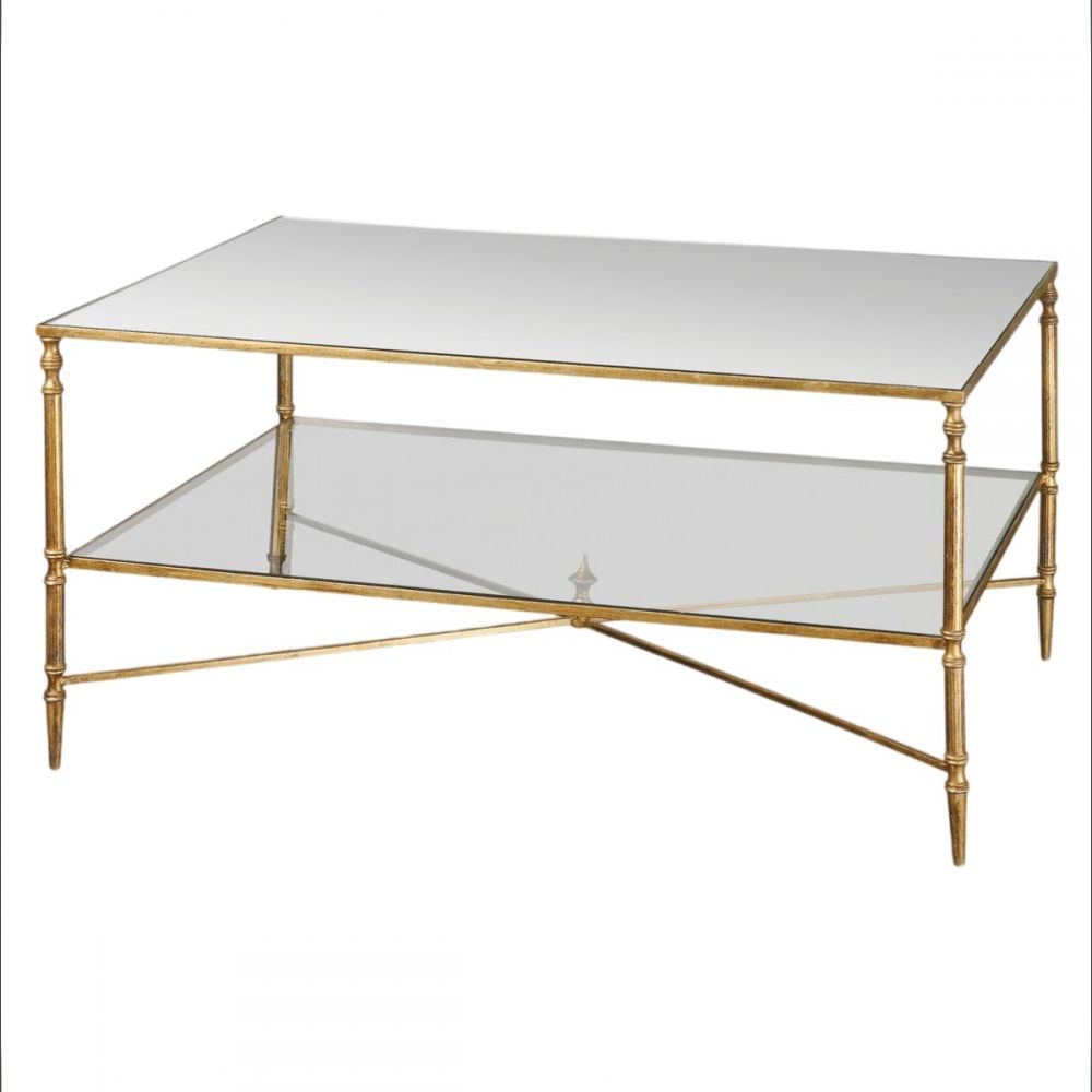 Материалы: рама – металл (золотистое покрытие), столешница – зеркальное полотно, полка – закаленное стекло