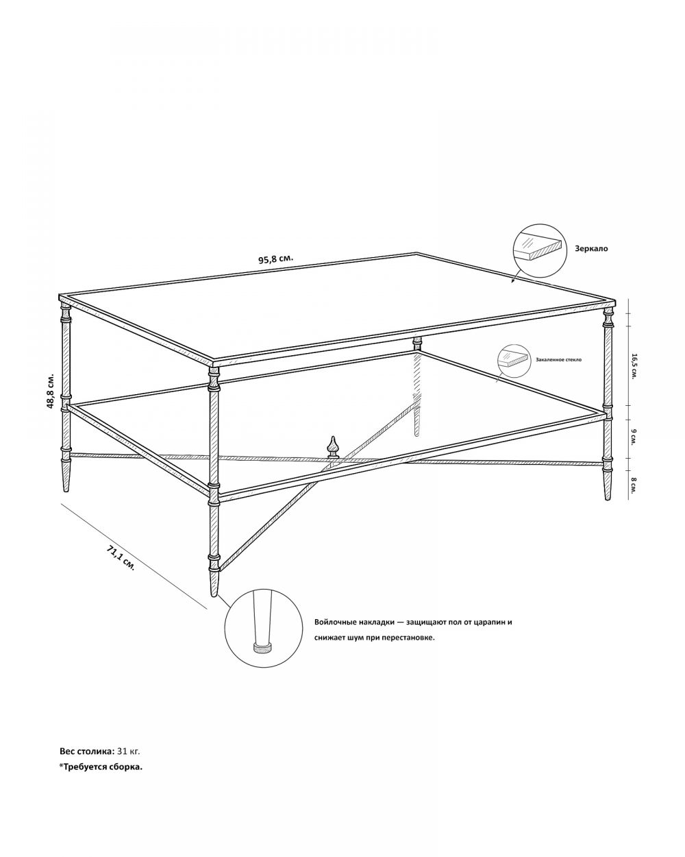 Металлическая рама с золотистым покрытием устойчива к царапинам и не тускнеет со временем. Зеркальная столешница – не только эстетичный, но и практичный элемент: она легко очищается и не боится влаги. Нижняя полка из закаленного стекла прочна и безопасна – выдерживает значительные нагрузки, при ударе рассыпается на мелкие безопасные осколки. Перекрестные вставки не только декоративны, но и усиливают конструкцию. Вес 31 кг обеспечивает устойчивость – столик не сдвинется от случайного касания. Требуется простая сборка (прикрутить ножки и полку), все крепления в комплекте.