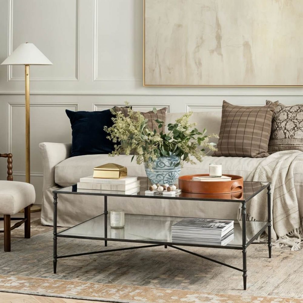 В гостиной перед диваном. Идеальный центральный элемент – на него можно поставить декор, разложить журналы, а на нижней полке хранить пледы или книги.