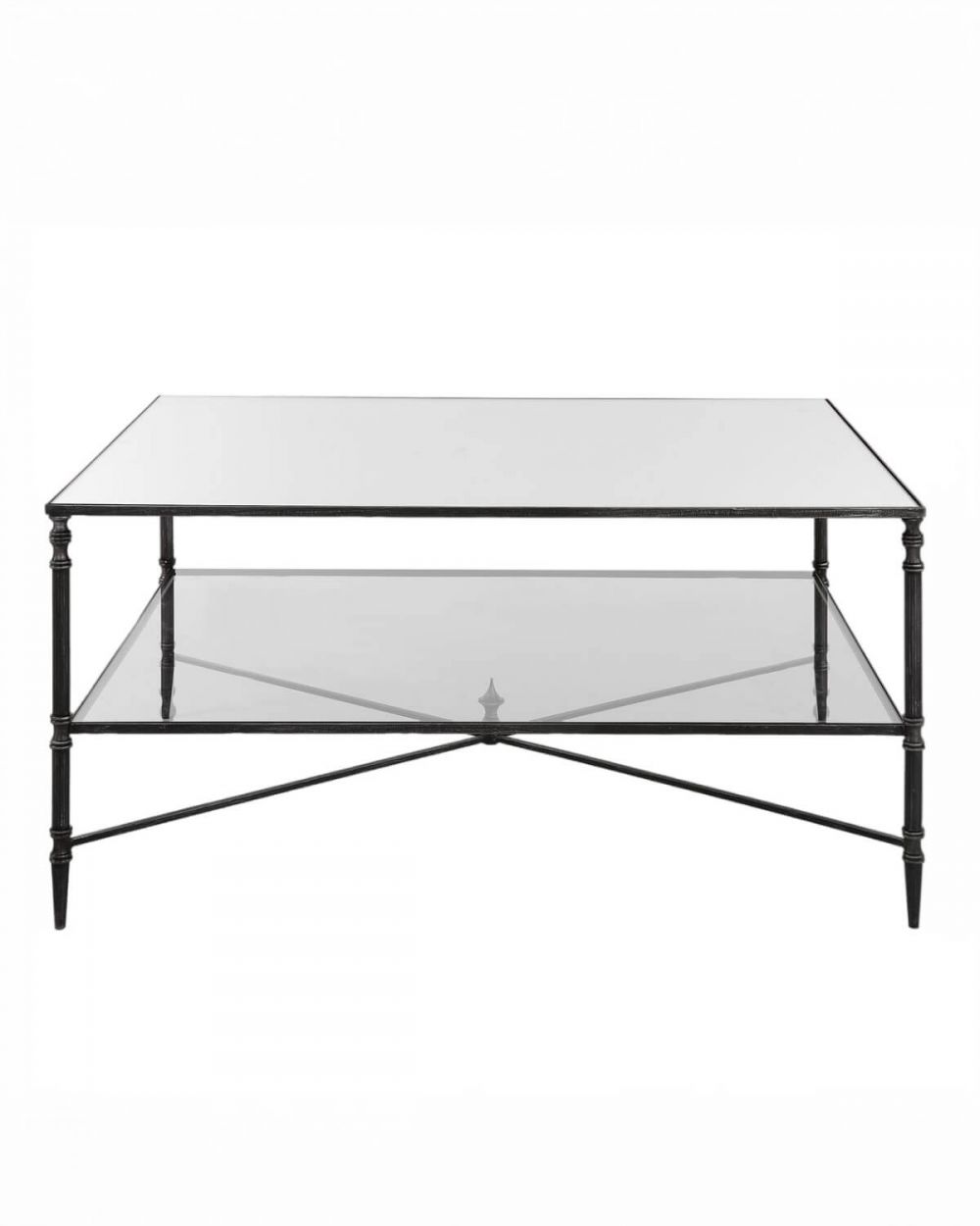 Черный журнальный столик «Хьюго» воплощает этот баланс с редкой элегантностью. Его главная особенность – прочная металлическая рама с элегантным черным покрытием и изящными перекрестными вставками, которые придают конструкции легкость и архитектурную выразительность. Две стеклянные поверхности – верхняя зеркальная столешница и нижняя полка из прозрачного закаленного стекла – создают ощущение воздушности и простора.
